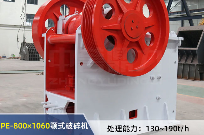 PE-800×1060顎式破碎機以進料口800×1060mm命名,較大進料粒度≤640mm,時處理能力在130-190噸,出料可調(diào)范圍在130-190mm,配備的8級110kw的電機,設備總重量是29.8噸。